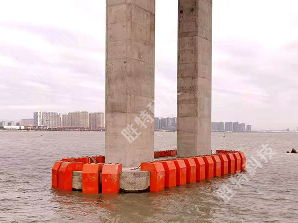 勝特公司采用自浮式鋼覆復合材料防撞設施12套,安裝在大橋橋墩四周,該防撞設施集合了目前已知防撞裝置的優點,不僅外形美觀,而且耐腐蝕性、抗衰老性、耐沖刷性極好,防撞效果也極強,可有效降低沖撞力60%以上。